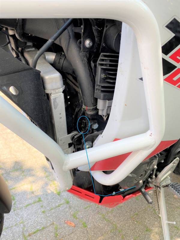 - Sollte der Seitenständer-Schalter Schaden genommen haben, kann durch den Seitenständer Bypass sichergestellt werden, dass die Maschine sich trotzdem starten lässt. Die Steckverbindung für die Montage lässt sich folgendermaßen finden. Folge dem Kabel des Seitenständer-Schalters (blaue Linie im Bild).